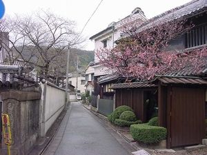 町中を歩いて最も気に入った風景 西光寺の門前の路地で、土蔵と中二階の町屋に梅の花、そして五月山がみえます。 |